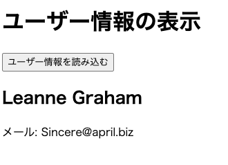 ボタンをクリックすると、まず「読み込み中...」と表示され、その後APIから取得したユーザーの名前とメールアドレスが表示されます。