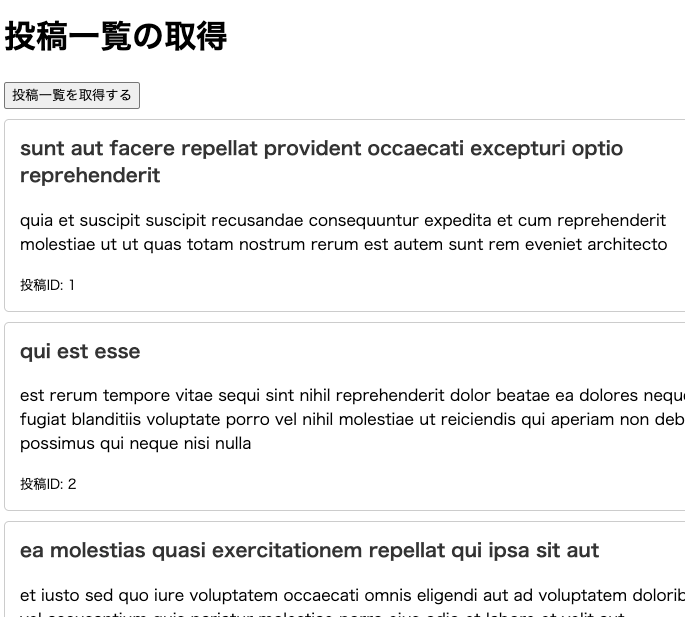 // 最初の5件だけを表示 for (let i = 0; i < 5; i++) { let post = posts[i]; let postElement = document.createElement('div'); postElement.className = 'post'; postElement.innerHTML = '<h3>' + post.title + '</h3>' + '<p>' + post.body + '</p>' + '<small>投稿ID: ' + post.id + '</small>'; container.appendChild(postElement); } }) .catch(function(error) { console.log('エラー:', error); document.getElementById('posts-container').innerHTML = '<p style="color: red;">データの取得に失敗しました。</p>'; }); }); </script></body></html>このファイルをブラウザで開いて、「投稿一覧を取得する」ボタンをクリックしてみてください。複数の投稿が一覧で表示されるはずです。