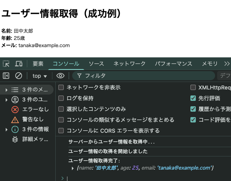 処理開始他の処理を続けます成功: データの取得に成功しましたより実用的な例として、ユーザー情報を取得する処理を模擬してみましょう。