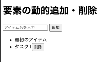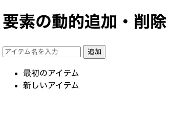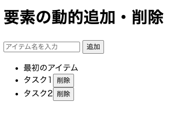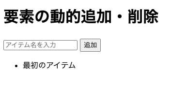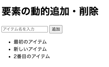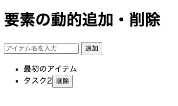 <!DOCTYPE html><html lang="ja"><head> <meta charset="UTF-8"> <meta name="viewport" content="width=device-width, initial-scale=1.0"> <title>要素の動的追加・削除</title></head><body> <h1>要素の動的追加・削除</h1>