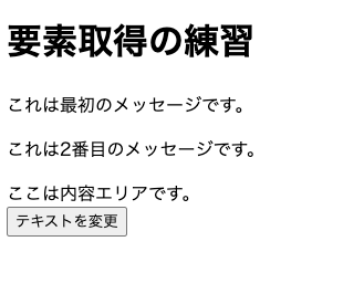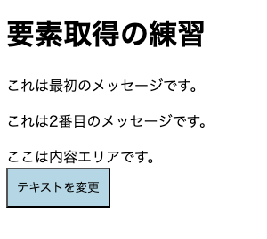 <!DOCTYPE html><html lang="ja"><head> <meta charset="UTF-8"> <meta name="viewport" content="width=device-width, initial-scale=1.0"> <title>要素取得の練習</title></head><body> <h1 id="page-title">要素取得の練習</h1> <p class="message">これは最初のメッセージです。</p> <p class="message">これは2番目のメッセージです。</p> <div id="content"> <span>ここは内容エリアです。</span> </div> <button id="change-btn">テキストを変更</button>