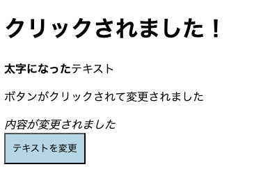 console.log('すべての要素が変更されました'); }); // --- 追加終了 ---</script>ブラウザを更新してボタンをクリックしてみてください。クリックすると、タイトル、2番目のメッセージ、スパン要素の内容がすべて変更されるはずです。