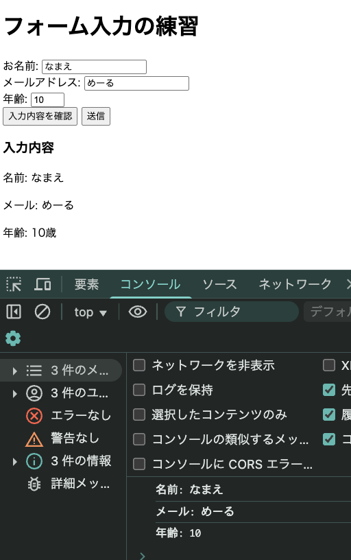 // 画面にも表示 resultDiv.innerHTML = ``; });</script>ブラウザを更新して、フォームに何か入力してから「入力内容を確認」ボタンをクリックしてみてください。入力した内容がコンソールと画面に表示されるはずです。