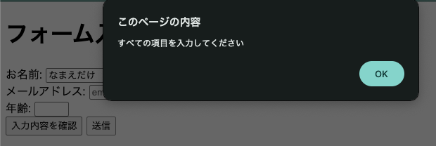 // 簡単な検証 if (username === '' || email === '' || age === '') { alert('すべての項目を入力してください'); return; }