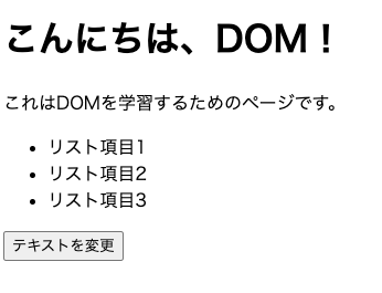 <!DOCTYPE html><html lang="ja"><head> <meta charset="UTF-8"> <meta name="viewport" content="width=device-width, initial-scale=1.0"> <title>DOM学習</title></head><body> <h1 id="main-title">こんにちは、DOM!</h1> <p class="description">これはDOMを学習するためのページです。</p> <ul> <li>リスト項目1</li> <li>リスト項目2</li> <li>リスト項目3</li> </ul> <button id="change-button">テキストを変更</button>