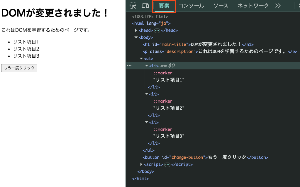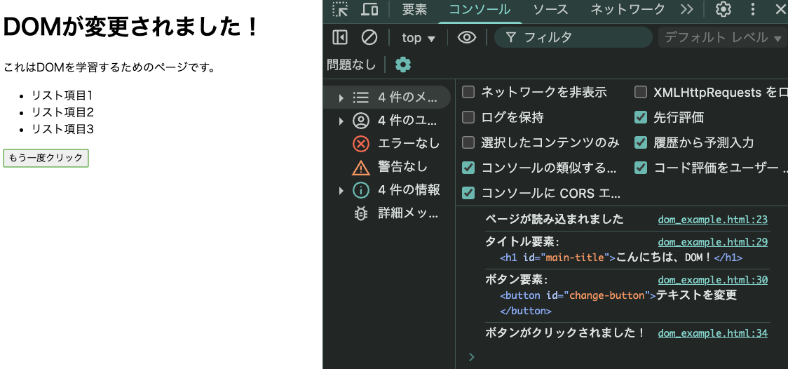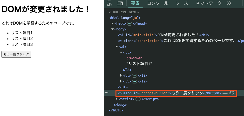 ボタンをクリックすると、ElementsタブのDOMツリー内で、<h1>要素のテキストが「こんにちは、DOM!」から「DOMが変更されました!」に変更されることを確認できるはずです。また、<button>要素のテキストも「テキストを変更」から「もう一度クリック」に変わることも確認できます。