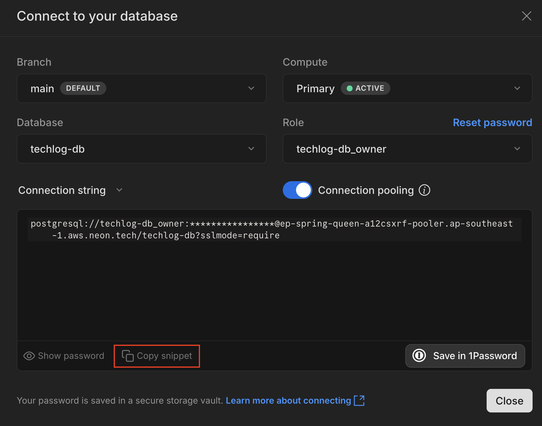 すると、データベースに接続するための情報が表示されます。Connection string という欄には、一部マスクされた URL が表示されています。[Copy snippet] を選択すると、クリップボードにコピーされ、貼り付けられる状態になります。