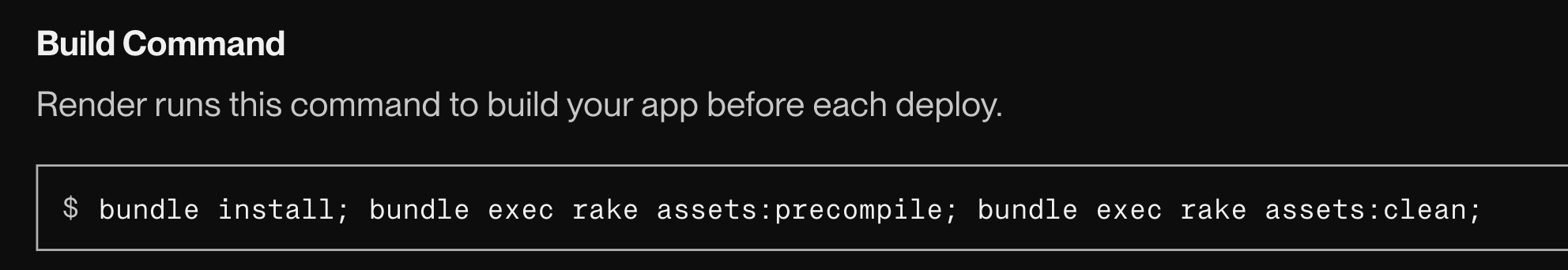 bundle install; bundle exec rake assets:precompile; bundle exec rake assets:clean; bundle exec rails db:create RAILS_ENV=production; bundle exec rails db:schema:load RAILS_ENV=production;bundle exec rails db:migrate RAILS_ENV=production;環境変数の設定(データベースの接続情報)