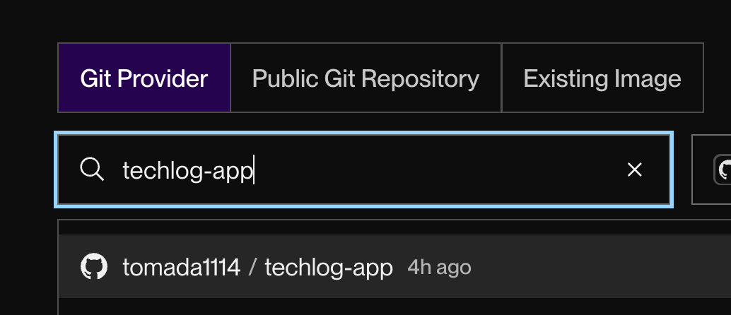 次に、デプロイしたい GitHub リポジトリと Render.com を連携させます。今回は [Git Provider] > [techlog-app] リポジトリを選択すると、自動的に連携されます。