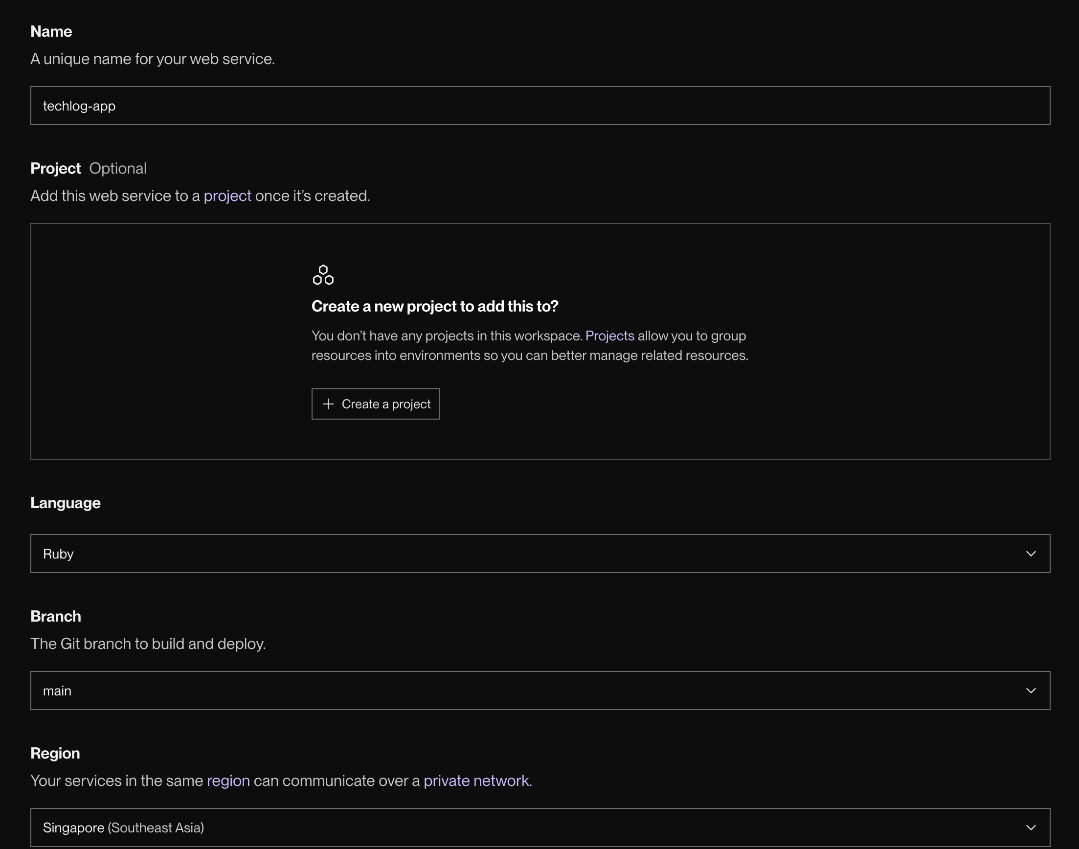 - Name: techlog-app(デフォルトのまま)