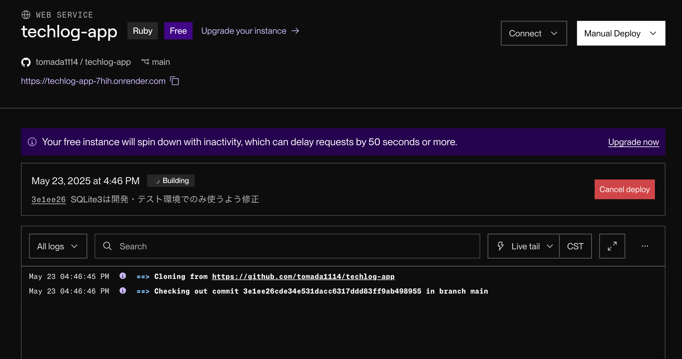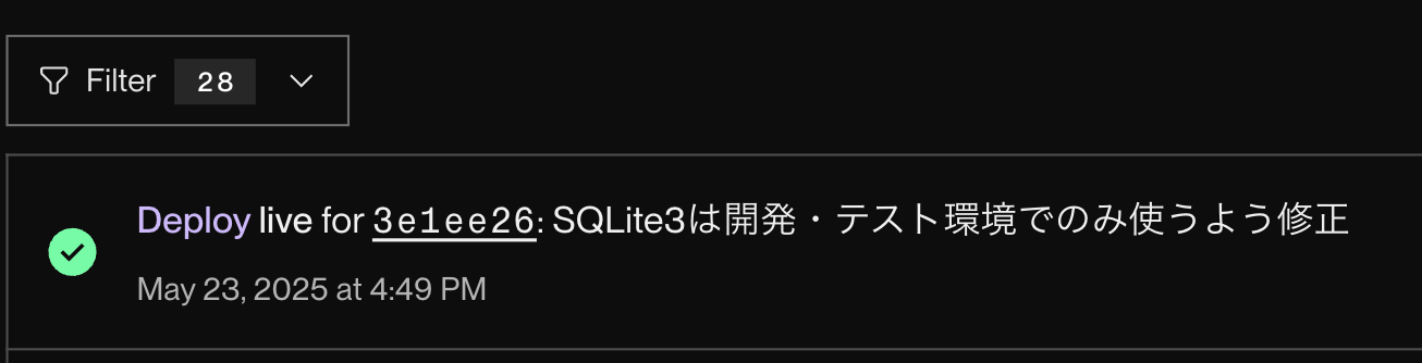 コミットして GitHub にプッシュすると、Render.com で自動的にデプロイが走りますので、特に何もする必要はありません。