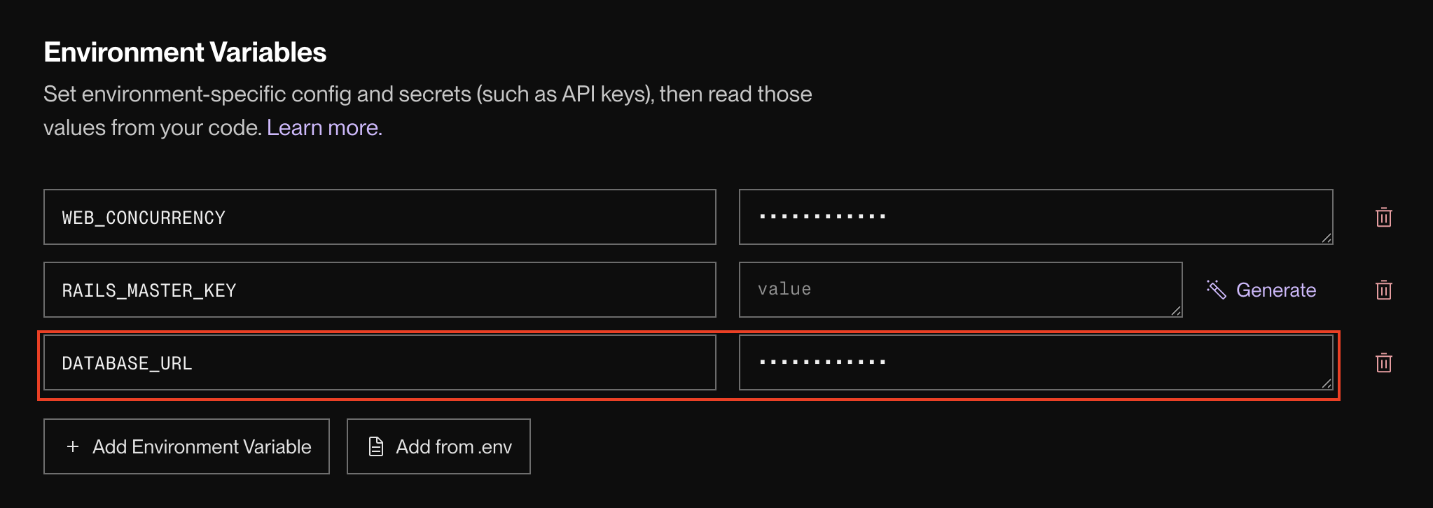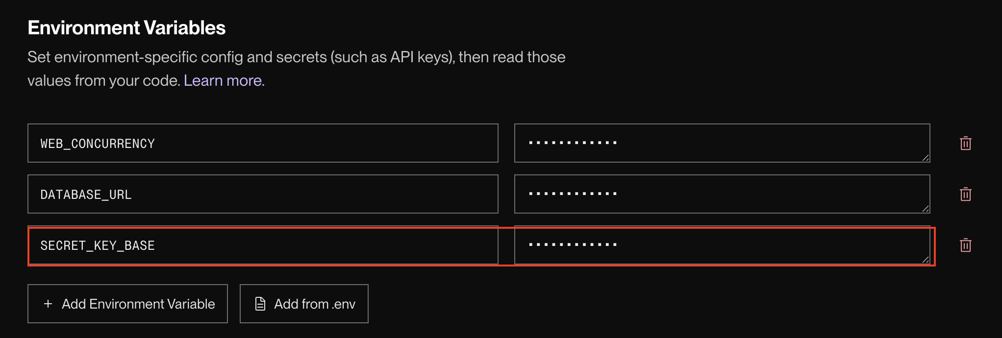 なお、元々あったRAILS_MASTER_KEY という1行は今回は使いませんので、右側のゴミ箱アイコンをクリックして削除してください。