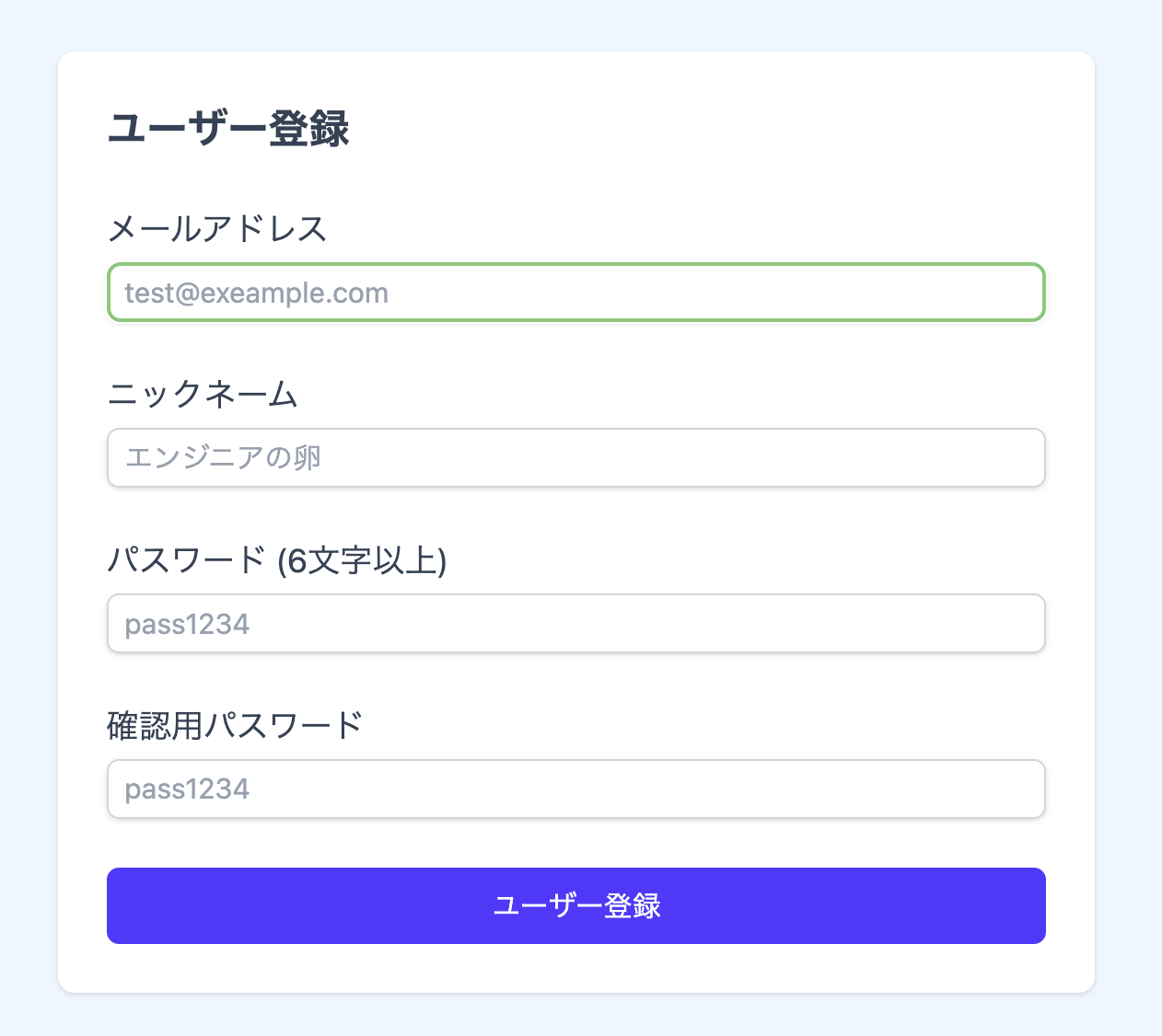 では、ユーザー登録のビューを次のように変更しましょう。Tailwind CSSのスタイルクラスを使ってデザインを調整し、前回追加したnicknameカラムの入力フィールドも追加します。