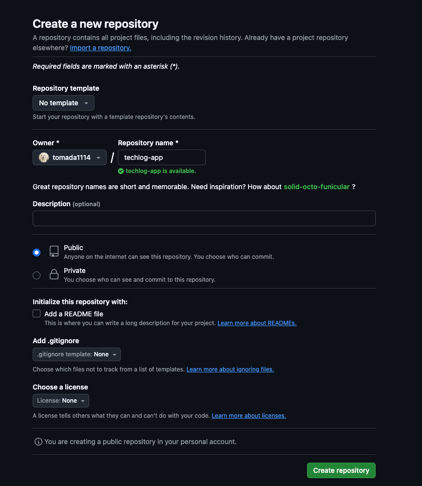 リモートリポジトリを作成するときは、以下のような設定にしましょう。リポジトリ名は techlog-app にしてください。