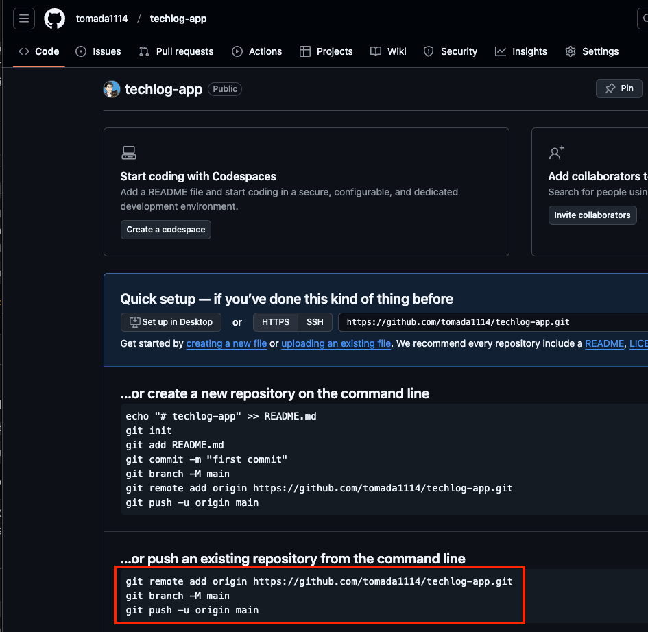 git remote add origin https://github.com/アカウント名/techlog-app.git