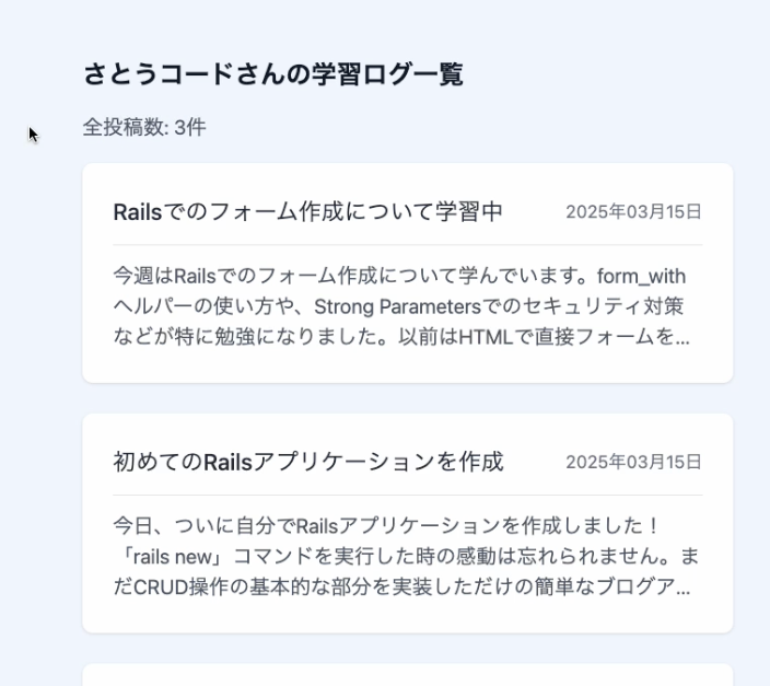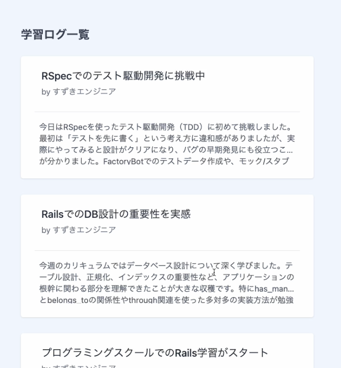 投稿した学習ログを一覧で確認できるため、自分の学習の軌跡を時系列で追えます。そのため、日々の積み重ねが可視化され、成長を実感しやすくなります。この機能では、データベースからの情報取得と表示方法について学ぶことができます。