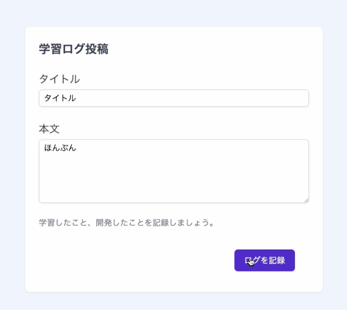 タイトルと本文を入力して、学習内容を記録できます。マークダウン記法にも対応しているので、コードも見やすく記録でき、後から振り返る際にも役立ちます。この機能を実装する過程で、フォーム処理やデータ保存の基本を習得できるでしょう。