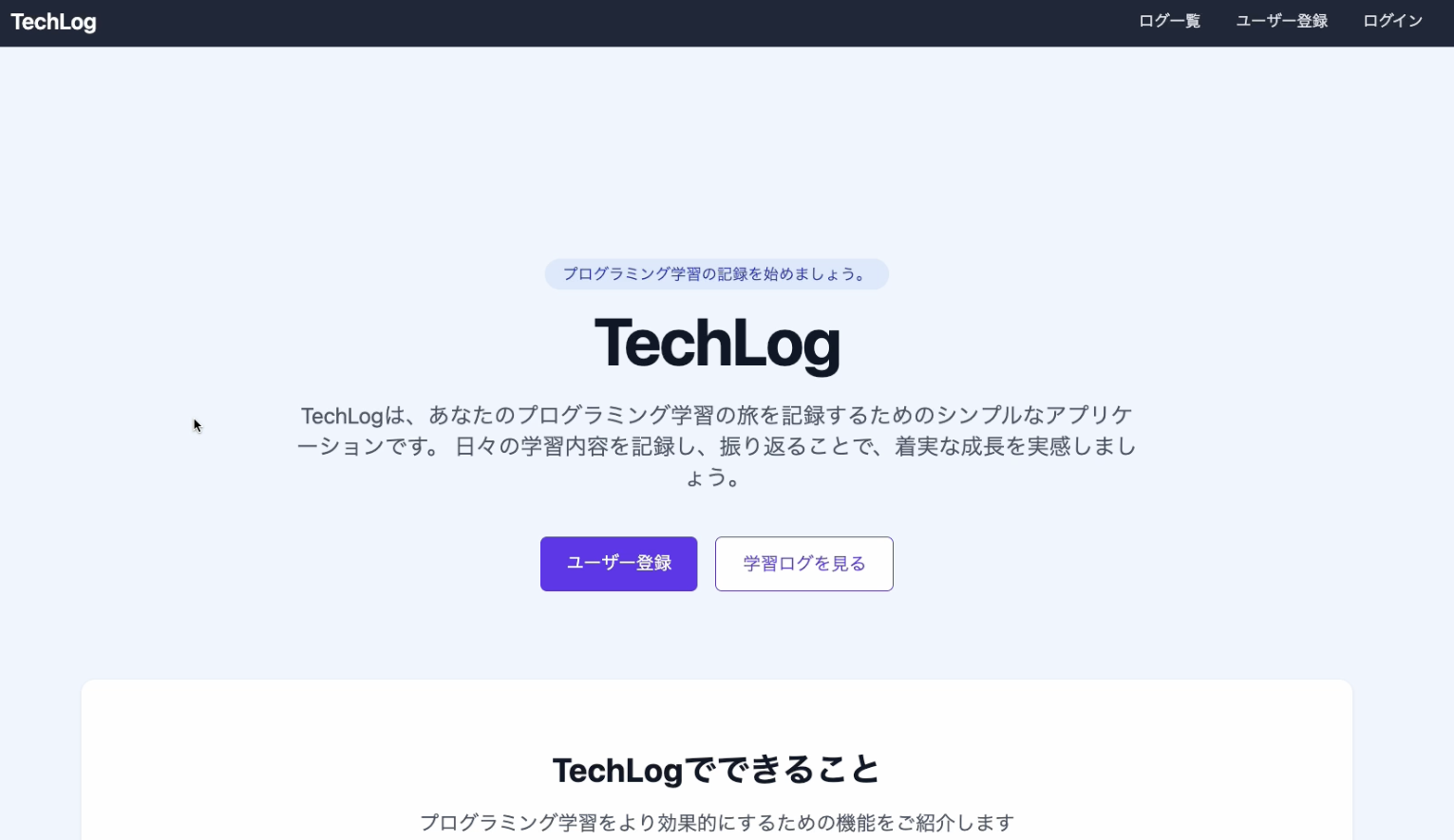 TechLog のトップページでは、アプリの概要説明と主要機能へのアクセスが可能です。シンプルで使いやすいデザインを心がけており、この画面からアプリ全体の導線がスムーズにつながるように設計されています。