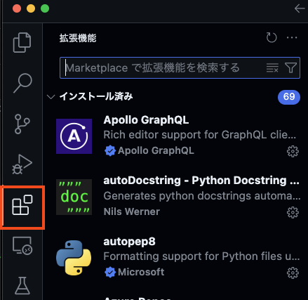 VS Codeの左側にあるサイドバーから、拡張機能アイコン(四角が4つ組み合わさったアイコン)をクリックします。 または、キーボードショートカットCtrl + Shift + X(Macの場合はCmd + Shift + X)でも開くことができます。