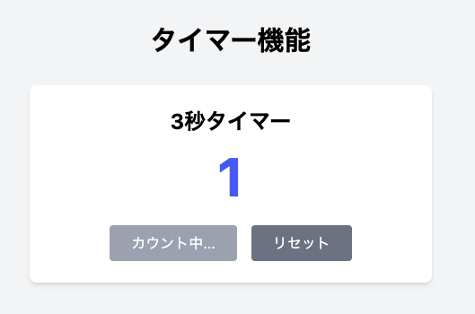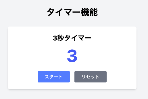 const startTimer = () => { setIsActive(true);};const resetTimer = () => { setIsActive(false); setSeconds(3);};startTimer関数は、タイマーを開始するためにisActiveをtrueに設定します。 そして、resetTimer関数はタイマーをリセットして、isActiveをfalseにし、残り時間を3秒に戻します。 最後に、タイマーの残り時間を表示し、時間が来たらメッセージを表示します。