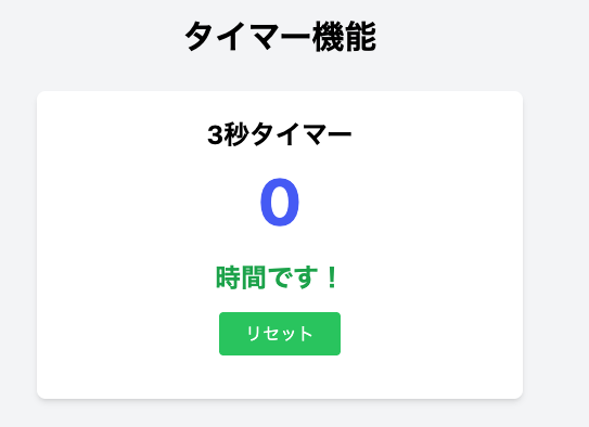 タイマーがスタートボタンをクリックするとカウントダウンが始まり、3秒後に「時間です!」というメッセージが表示されます。