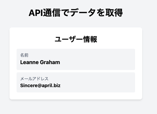 if (loading) { return ( <div className="p-6 max-w-md mx-auto bg-white rounded-lg shadow-md"> <div className="text-center"> <p className="text-lg">データを読み込み中...</p> </div> </div> );}そしてデータの取得が完了したら、ユーザーの名前とメールアドレスを表示します。