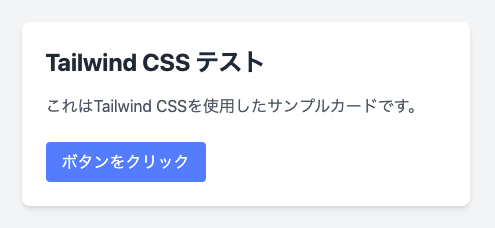 <!doctype html><html><head> <meta charset="UTF-8" /> <meta name="viewport" content="width=device-width, initial-scale=1.0" /> <title>Tailwind CSS Test</title> <script src="https://cdn.jsdelivr.net/npm/@tailwindcss/browser@4"></script></head><body class="bg-gray-100 p-8"> <div class="max-w-md mx-auto bg-white rounded-lg shadow-md p-6"> <h1 class="text-2xl font-bold text-gray-800 mb-4"> Tailwind CSS テスト </h1> <p class="text-gray-600 mb-6"> これはTailwind CSSを使用したサンプルカードです。 </p> <button class="bg-blue-500 text-white px-4 py-2 rounded hover:bg-blue-600"> ボタンをクリック </button> </div></body></html>このコードでは、以下のようなスタイルが適用されます。