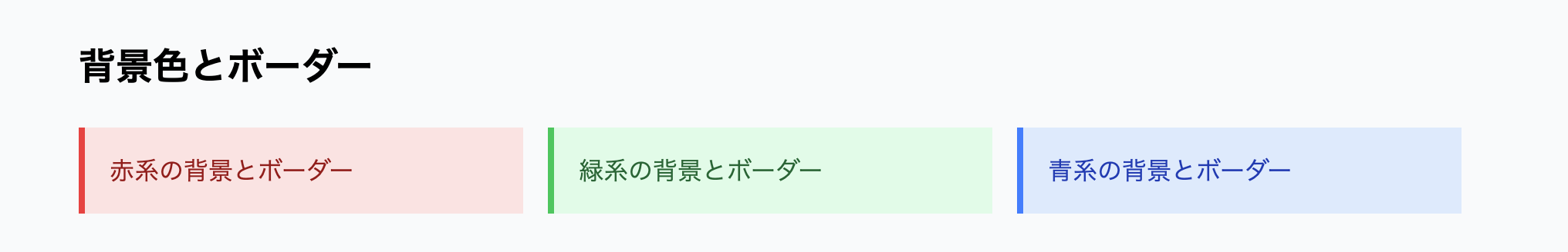 <div class="grid grid-cols-1 md:grid-cols-3 gap-4"> <div class="bg-red-100 border-l-4 border-red-500 p-4"> <p class="text-red-800">赤系の背景とボーダー</p> </div> <div class="bg-green-100 border-l-4 border-green-500 p-4"> <p class="text-green-800">緑系の背景とボーダー</p> </div> <div class="bg-blue-100 border-l-4 border-blue-500 p-4"> <p class="text-blue-800">青系の背景とボーダー</p> </div> </div></section>ブラウザでこのHTMLファイルを開くと、以下のようなセクションが表示されます。