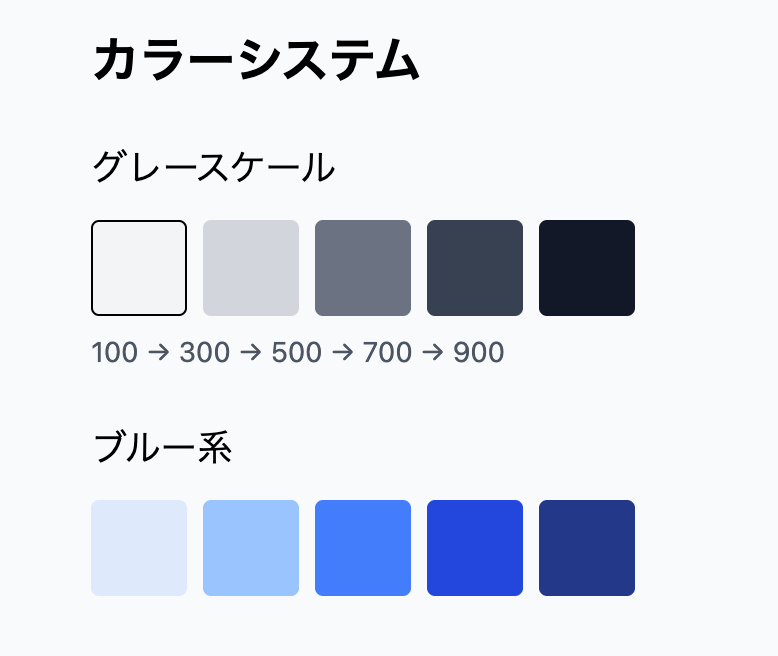 <div class="mb-6"> <h3 class="text-lg font-medium mb-3">グレースケール</h3> <div class="flex space-x-2"> <div class="w-12 h-12 bg-gray-100 rounded border"></div> <div class="w-12 h-12 bg-gray-300 rounded"></div> <div class="w-12 h-12 bg-gray-500 rounded"></div> <div class="w-12 h-12 bg-gray-700 rounded"></div> <div class="w-12 h-12 bg-gray-900 rounded"></div> </div> <p class="text-sm mt-2 text-gray-600">100 → 300 → 500 → 700 → 900</p> </div>