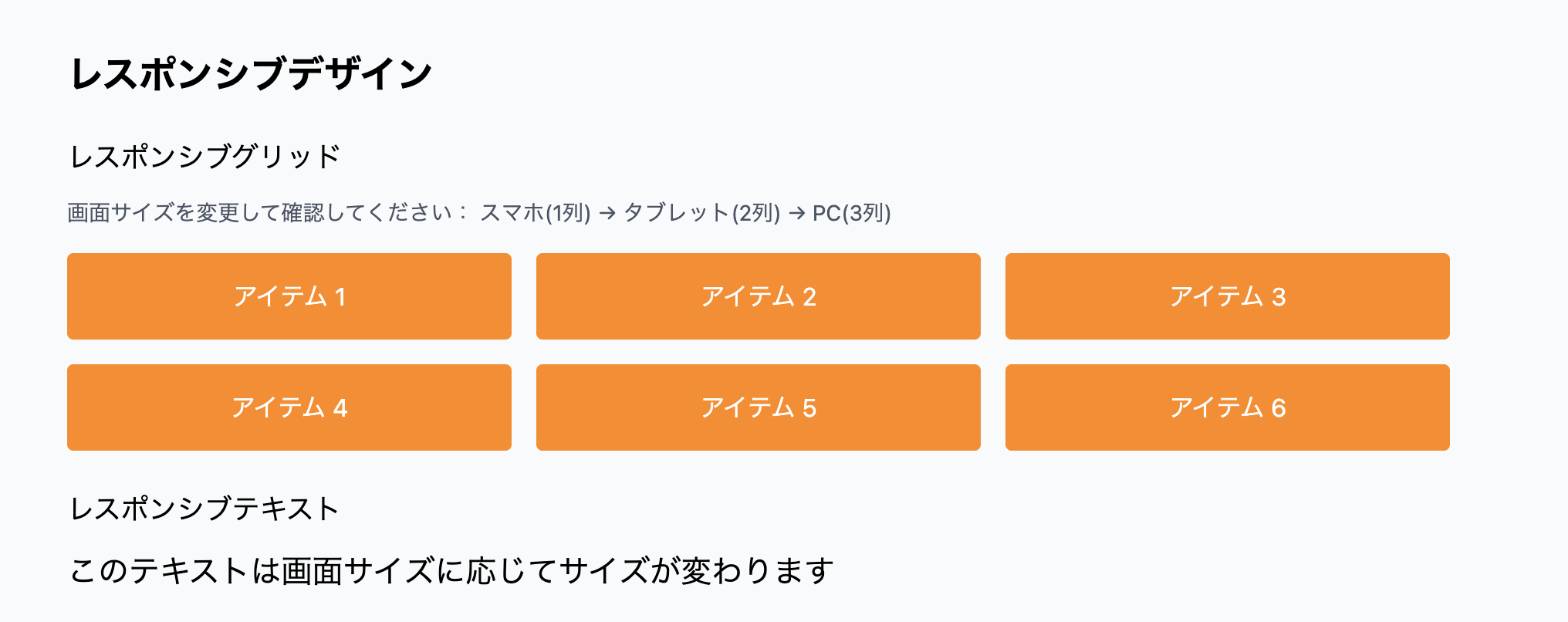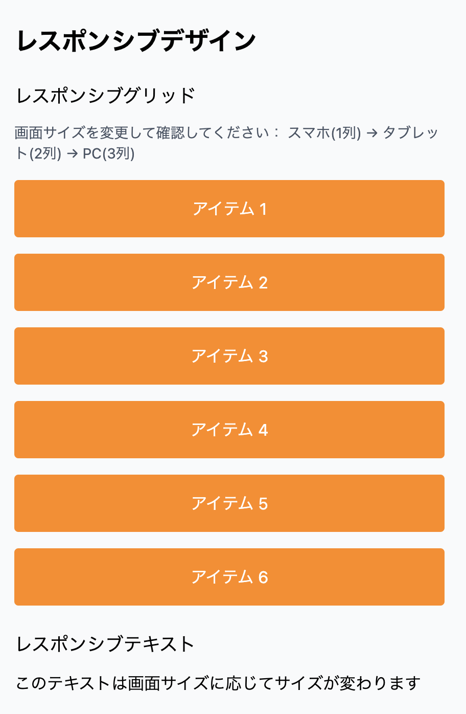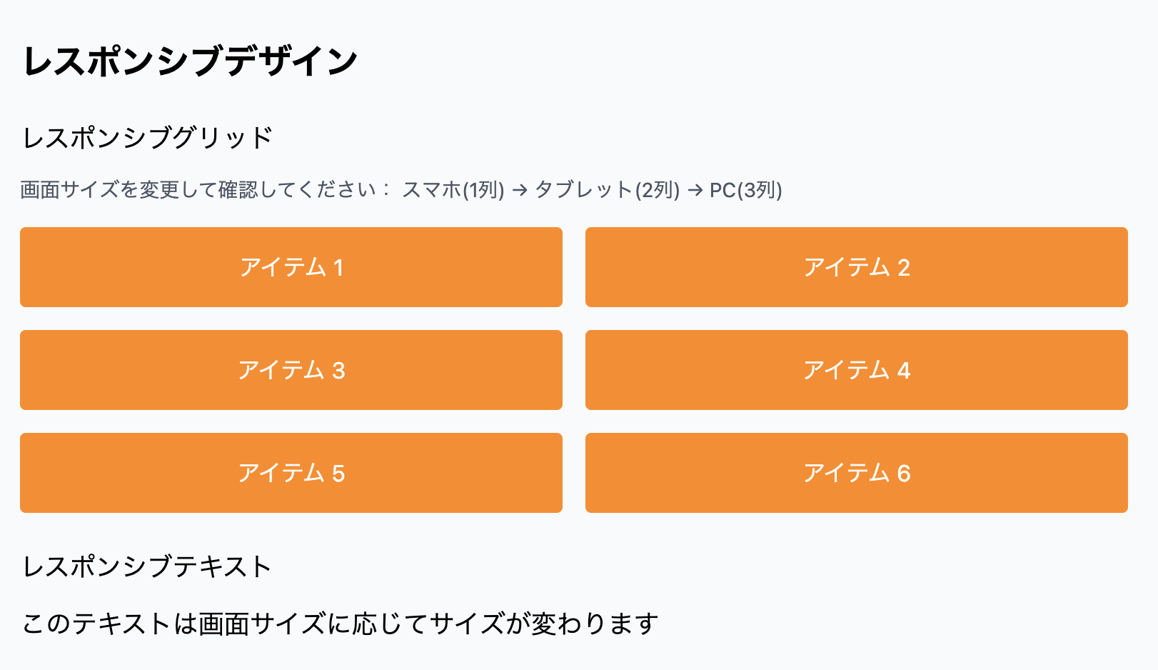 <div class="mb-6"> <h3 class="text-lg font-medium mb-3">レスポンシブグリッド</h3> <p class="text-sm text-gray-600 mb-4"> 画面サイズを変更して確認してください: スマホ(1列) → タブレット(2列) → PC(3列) </p> <div class="grid grid-cols-1 md:grid-cols-2 lg:grid-cols-3 gap-4"> <div class="bg-orange-400 p-4 rounded text-center text-white"> アイテム 1 </div> <div class="bg-orange-400 p-4 rounded text-center text-white"> アイテム 2 </div> <div class="bg-orange-400 p-4 rounded text-center text-white"> アイテム 3 </div> <div class="bg-orange-400 p-4 rounded text-center text-white"> アイテム 4 </div> <div class="bg-orange-400 p-4 rounded text-center text-white"> アイテム 5 </div> <div class="bg-orange-400 p-4 rounded text-center text-white"> アイテム 6 </div> </div> </div>