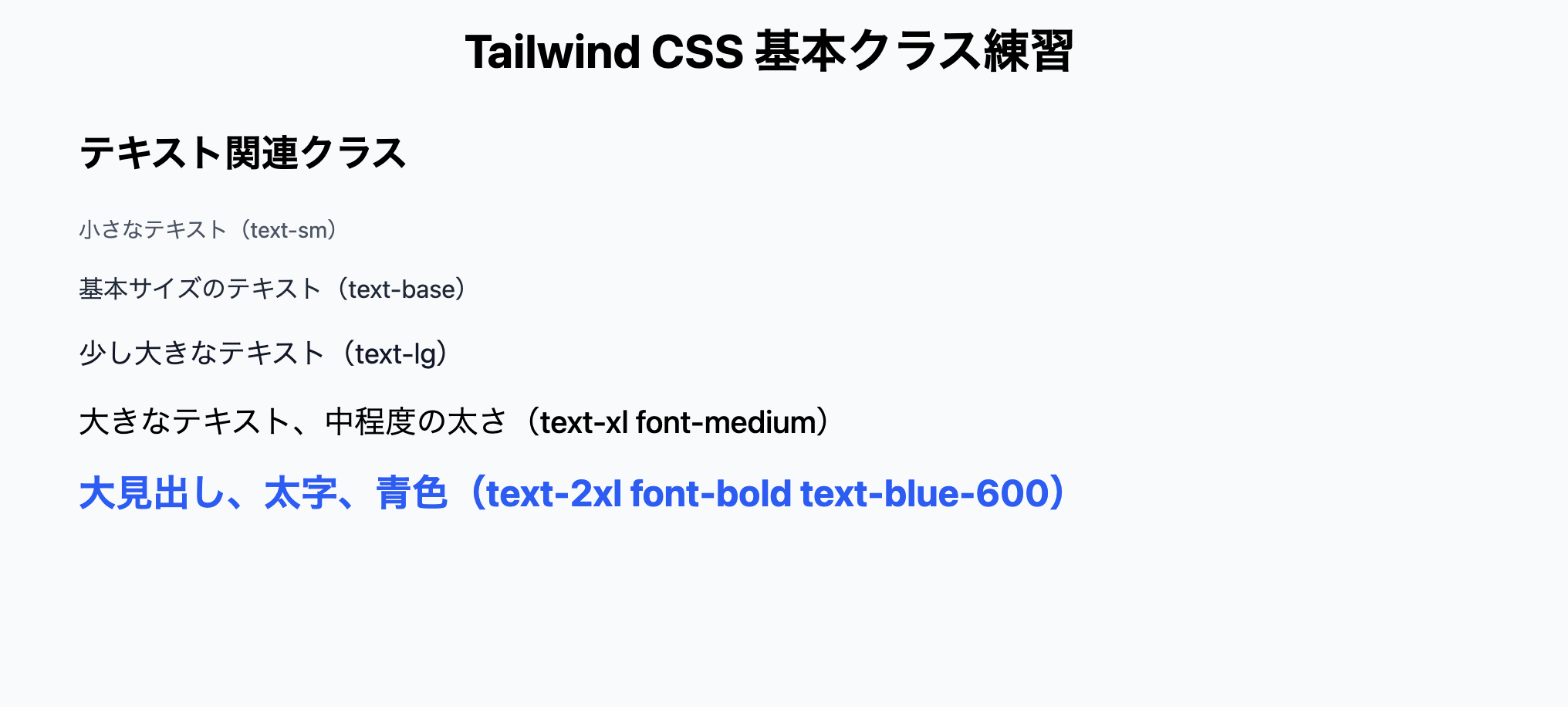 <div class="space-y-4"> <p class="text-sm text-gray-600">小さなテキスト(text-sm)</p> <p class="text-base text-gray-800">基本サイズのテキスト(text-base)</p> <p class="text-lg text-gray-900">少し大きなテキスト(text-lg)</p> <p class="text-xl font-medium">大きなテキスト、中程度の太さ(text-xl font-medium)</p> <p class="text-2xl font-bold text-blue-600">大見出し、太字、青色(text-2xl font-bold text-blue-600)</p> </div></section>ブラウザでこのHTMLファイルを開くと、以下のようなテキストが表示されます。