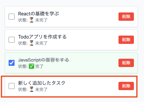 function App() { const [todos, setTodos] = useState([ { id: 1, text: "Reactの基礎を学ぶ", completed: false }, { id: 2, text: "Todoアプリを作成する", completed: false }, { id: 3, text: "JavaScriptの復習をする", completed: true } ]);