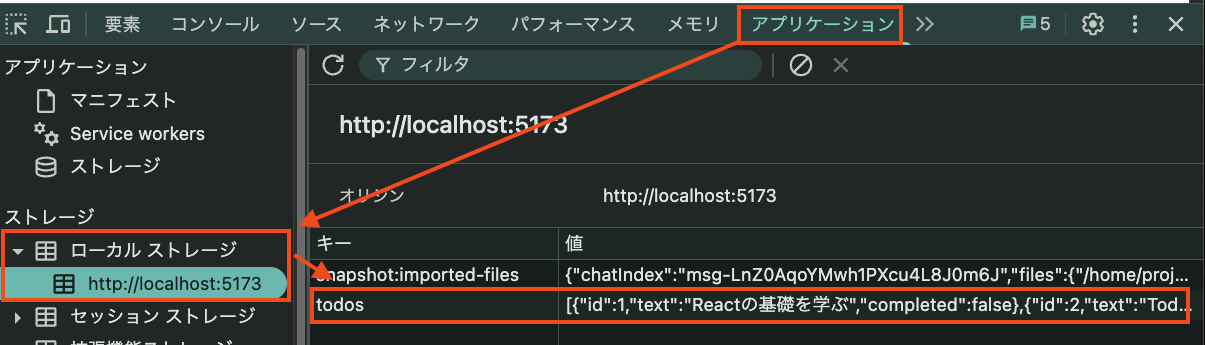 さらに、左側のリストから http://localhost:5173 を選択すると、右側にlocalStorageの内容が表示されます。