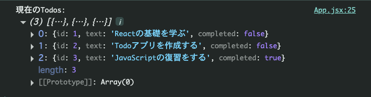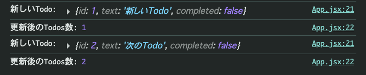 setTodos([...todos, newTodo]);};Todoを追加するたびに、コンソールで新しいTodoの情報と配列の長さが表示されることを確認してください。