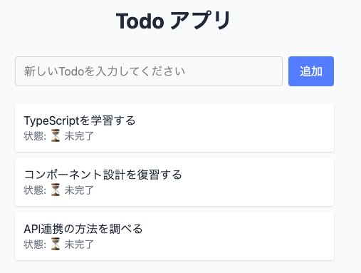 「TypeScriptを学習する」「コンポーネント設計を復習する」「API連携の方法を調べる」など、複数の Todoを順番に追加してみてください。