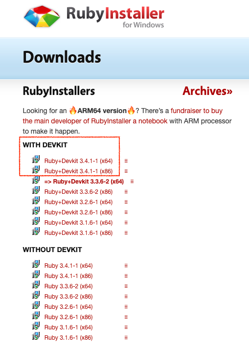 Ruby+Devkit 3.4.1-1 (x64)を選択 - 32ビットシステムの場合: